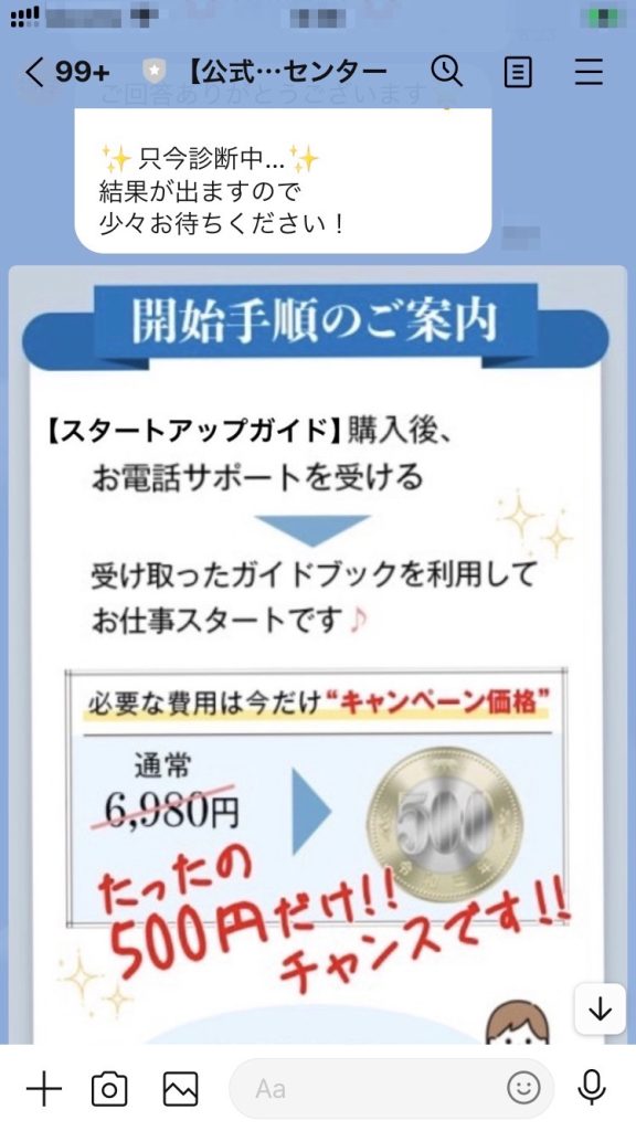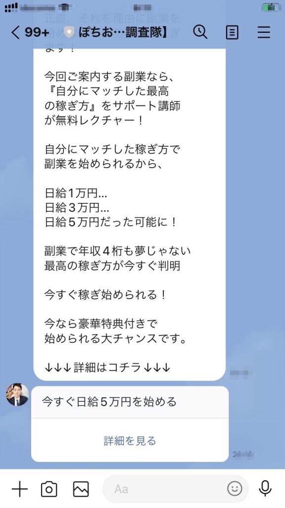 一つ目は、「【ぽちお【ネットビジネス調査隊】」というLINEアカウントからの案内です。