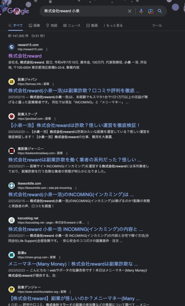 しかし、「株式会社reward 小泉」などで検索をしてみたところ・・・